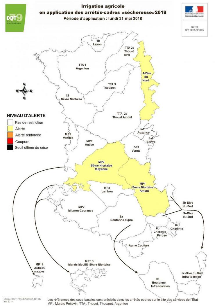 Les conditions météorologiques de ces dernière semaines ont conduit à l'abaissement de certaines nappes souterraines et à la baisse du débit de cours d'eau. En conséquence, la préfecture des Deux-Sèvres a déclenché l'alerte sur les sous-bassins de la Sèvre niortaise amont (MP1) et de la Sèvre niortaise moyenne (MP2). Cela se traduit par la réduction du volume prélevable pour la période de printemps (du 1er avril au 31 mai), par rapport au volume total autorisé, pour les irrigants du secteur.