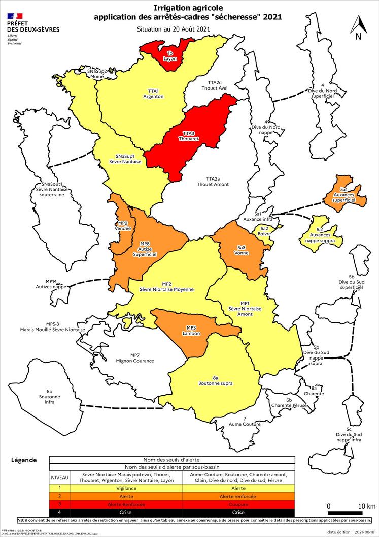 Sur les sous-bassins de la Sèvre Niortaise Amont (MP1) et de la Sèvre Niortaise Moyenne (MP2), la mesure d'alerte (niveau 2) consiste à une réduction de 50 % des volumes irrigation fractionnés à la semaine. Les manoeuvres d'ouvrages sur cours d'eau sont interdites.