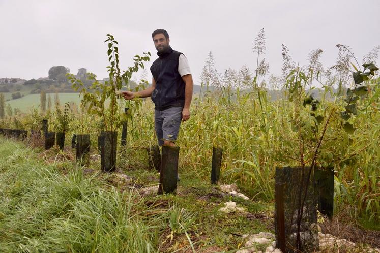 La Bioliferme replante des haies depuis plusieurs années. À Saint-Amant-de-Montmoreau, dans ce paysage vallonné, Mélanie et Pierre-Luc Duperray ont à cœur de pratiquer une agriculture éco-responsable. "Je me suis installé en 2011 sur la ferme de mon père, qui cultivait des salades, des poireaux, etc. Mélanie m'a rejoint en 2020. Nous sommes passés de 12 à 140 hectares en achat et en location". Ils avaient déjà planté des haies en 2018 et en 2020. "Nous avons planté une première haie double de 245 mètres en 2018, pour apporter de l'ombre aux chèvres. Cela permet de leur apporter de la fraîcheur, d'allonger leur pâturage. Les haies permettent aussi de limiter les dérives des produits phytosanitaires utilisés par les voisins. En 2022, ce sont 700 mètres de haies qui ont été plantés avec l'aide de l'association Prom'Haies". Cette fin d'année, la ferme caprine replante 555 mètres de haies.
