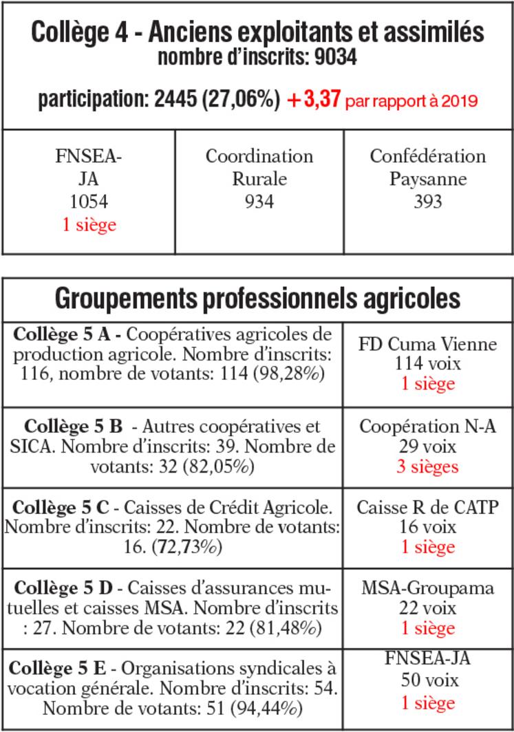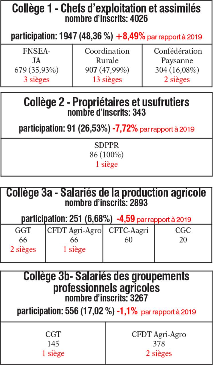 C'est le taux de participation dans le collège des exploitants (1), soit une nette progression par rapport au scrutin de 2019 (39,87 %). Au final, même si le nombre d'inscrits dans ce collège a largement baissé (de 4635 à 4026), le nombre de personnes ayant pris part au scrutin a progressé: 1 947 contre 1 848 en 2019. Tous collèges confondus, le nombre d'inscrits était de 19 821 et 5 525 personnes ont participé au scrutin, soit un taux de participation global de 27,87 %.