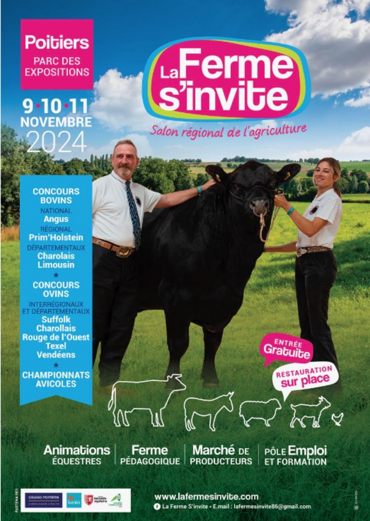 Dans moins de deux mois, le Parc des Expositions de Poitiers prendra des airs de campagne, puisque la Ferme s'Invite s'y installera du 8 au 11 novembre, avec en vedette la race Angus, dont le concours national se déroulera pendant l'évènement. Si le programme est déjà bien ficelé, l'association organisatrice propose un échange le 27 septembre avec les partenaires et exposants pour présenter l'édition, mais aussi faire un point sur les concours d'animaux, évoquer la logistique de chaque pôle, ou faire de derniers aménagements.