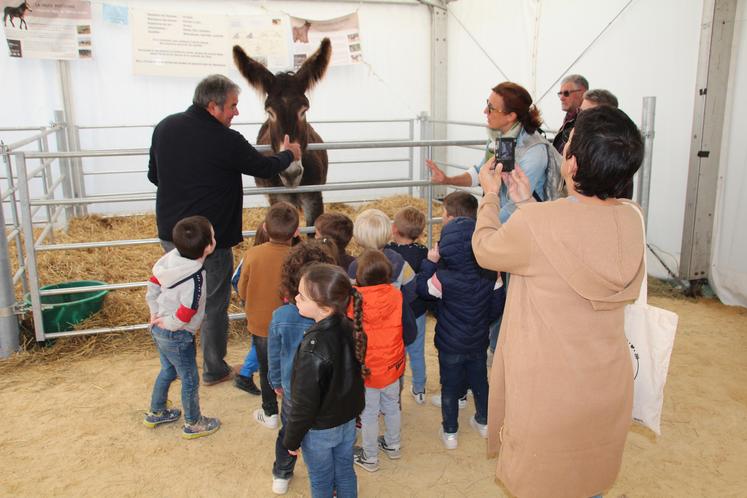 Les classes d’écoles maternelles des environs arrivent ce matin-là par grappes successives aux abords de la ferme découverte. Accompagnés de leurs enseignants, ils pénètrent sous le grand chapiteau pour avoir un aperçu de ce qu’est l’agriculture. On passe des grandes cultures, avec la présentation de pieds de maïs, de colza, de sorgho et de tournesol, à la basse-cour, où il est même possible de toucher les poussins. Avant, les petits écoliers ont fait une halte aux tables de la Boulangerie d’Antan, où des boulangères à la retraite, bénévoles du comité d’expansion agricole du Loudunais, leur expliquent les différentes étapes pour fabriquer du pain. En face, les petits groupes s’essayent à un autre exercice : reconnaître des légumes du potager. En continuant d’arpenter les allées, c’est la rencontre avec d’autres animaux qui fait sensation. Les élèves assistent même à l’échographie d’une chèvre. « Comment s’appelle le petit du cheval ?