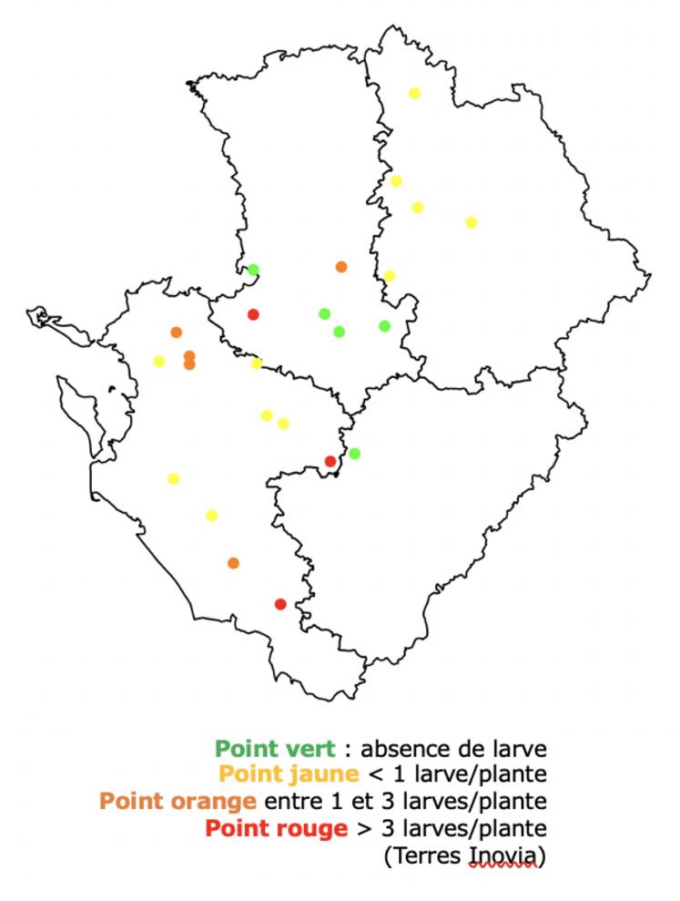 La colonisation s’accélère encore. Elle touche 19 parcelles sur les 24 qui ont fait l’objet d’une surveillance, contre 15 sur 24 la semaine dernière. De plus, on relève en moyenne 1,7 larve par plante, contre 1,3 au milieu du mois. Trois parcelles dépassent le seuil de risque (3 larves par plante) et le maximum relevé a été constaté à Siecq (79) avec 7 insectes par plante. Le risque est désormais modéré à fort.