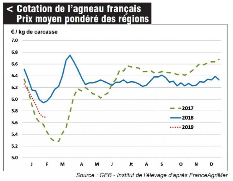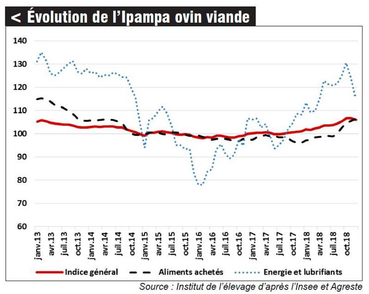 Sur l'ensemble de l'année, le prix des agneaux a progressé de 1 %. La conjoncture est surtout marquée par le retour de prix légèrement supérieurs au premier semestre (contre-saison) par rapport au second. Cette courbe des prix a permis aux systèmes intensifs, produisant davantage en contre-saison, de compenser la baisse de l'aide ovine et l'impact de la convergence des aides découplées. Cependant, elle ne suffit pas pour faire face à l'inflation sur les charges. L'Ipampa (indice des prix d'achat des moyens de production agricole) ovin viande a progressé de 3,8 % sur l'année, et parmi les principales augmentations, on peut citer les carburants (+19,5 %), les aliments achetés (+3,7 %) et les frais vétérinaires (+2,1 %).
