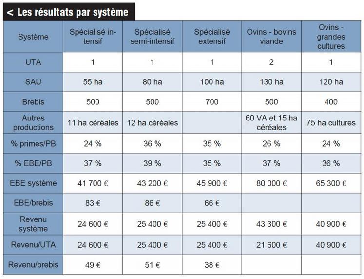 Les revenus des trois cas-types ovins spécialisés de Poitou-Charentes sont de l'ordre de 25 000 EUR/UMO, pour des contextes de production et des structures très différents. Le plus petit système, avec 500 brebis sur 55 hectares en zone à bon potentiel, est caractérisé par la présence de maïs ensilage et l'accélération du rythme de reproduction. À l'opposé, le plus extensif détient 700 brebis sur 100 hectares tout en herbe, avec une part réduite de contre-saison et l'achat de tous les concentrés.