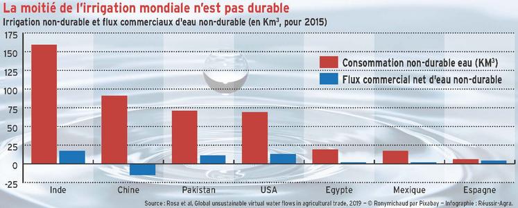 52% du volume d’irrigation mondial, soit 569 km3, ne serait pas durable car il « épuise les ressources en eau douce et/ou les flux environnementaux », d’après un article publié en octobre dans la revue Environmental Research Letters par des chercheurs de Berkeley (Californie), de Milan et du Yunnan (Chine). Des chiffres obtenus sur la base de données de 2015, en croisant les besoins des cultures, les surfaces irriguées, les productions nationales, et les ressources en eau douce. L’Inde serait responsable de près de 30 % de ces irrigations non-renouvelables, majoritairement liées à sa production de blé. Dans une seconde partie de l’étude, les chercheurs évaluent la proportion d’eau non-renouvelable qui partirait dans les flux commerciaux mondiaux. D’après leurs résultats, près de 15 % de cette eau seraient utilisés pour des cultures exportées.
