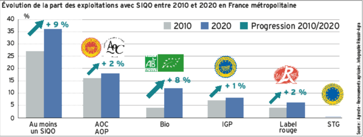 Entre 2010 et 2020, la part des exploitations avec Siqo (AB, AOC/AOP, IGP, label rouge, STG) est passée de 27 % à 36 %. Cet essor est essentiellement porté par l’agriculture biologique qui compte 29 000 producteurs de plus en dix ans.