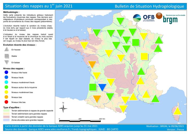 En mai 2021, les tendances d'évolution sont à la baisse sur la majorité des nappes. Ce constat est habituel à cette période de l’année. En effet, les pluies arrivant à s’infiltrer dans les sols sont absorbées par la végétation et n’atteignent que rarement les nappes. Les pluies de mai ont eu un impact significatif uniquement sur les nappes de l’est du territoire, de l’Alsace au littoral méditerranéen.