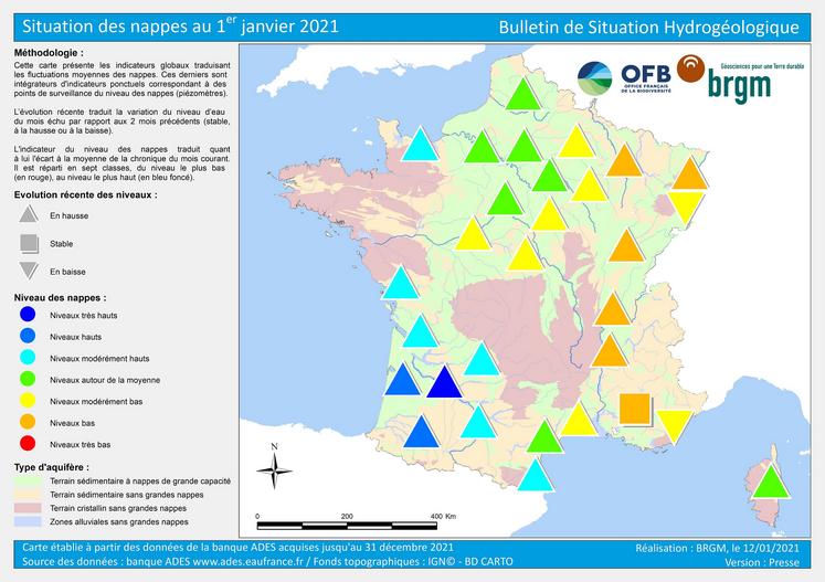 En décembre 2020, les niveaux des nappes sont majoritairement en hausse. La recharge a débuté entre fin septembre et décembre sur l’ensemble des nappes du territoire. Seuls les secteurs en déficit pluviométrique sont toujours en baisse ou stables : Alsace sud, Provence et Alpes du sud.
