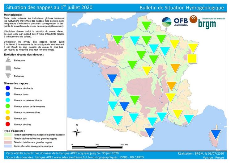 La situation au mois de juin reste satisfaisante sur une grande partie du territoire avec des niveaux autour de la moyenne voire supérieurs à celle-ci. La situation reste moins favorable dans les secteurs où la recharge et les pluies du printemps ont été moins importantes.