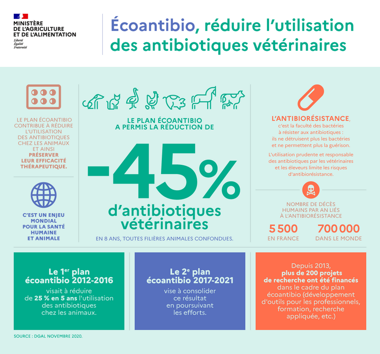 En France, la « baisse de l'antibiorésistance [...] continue » en 2019. Un constat issu du rapport annuel du réseau Résapath, qui quantifie depuis 1982 les bactéries pathogènes animales résistantes aux antibiotiques. « Les tendances à la baisse pour les antibiotiques critiques et non critiques se confirment en 2019 », constate l'Anses. La catégorie « critique » comprend notamment les céphalosporines de 3e et 4e générations (C3G/C4G), ou encore les fluoroquinolones, des molécules « cruciales pour la santé humaine et [qui] n'ont pas ou peu d'alternatives ».