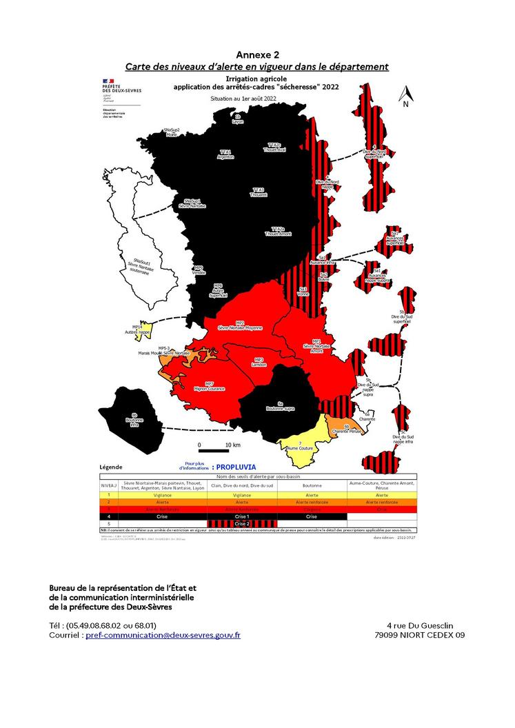 Dans ce contexte, de nouvelles mesures de restriction des usages de l’eau ont été prises s’ajoutant aux précédentes. Les mesures de restriction s’appliquent pour l'irrigation agricole et pour les usages publics ou privés à compter du vendredi 29 juillet 2022 à 8h pour le bassin de la Charente et le lundi 1er août 2022 à 8h pour le bassin de la Dive du Nord.
