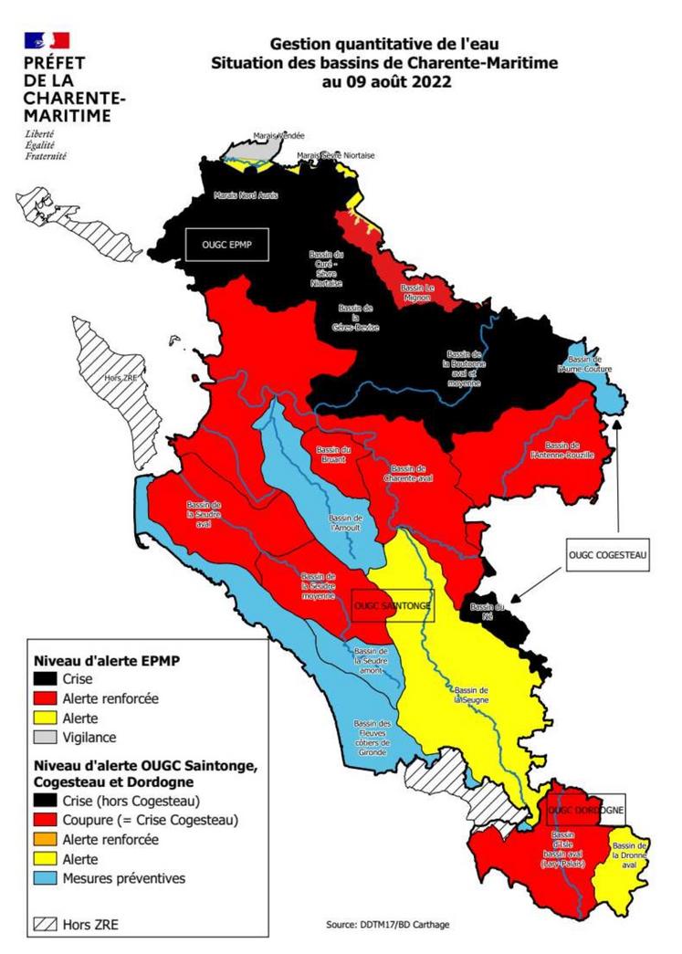 Compte tenu de l’état de la ressource en eau, le préfet de la Charente-Maritime prend les mesures de limitation des usages de l’eau suivantes :