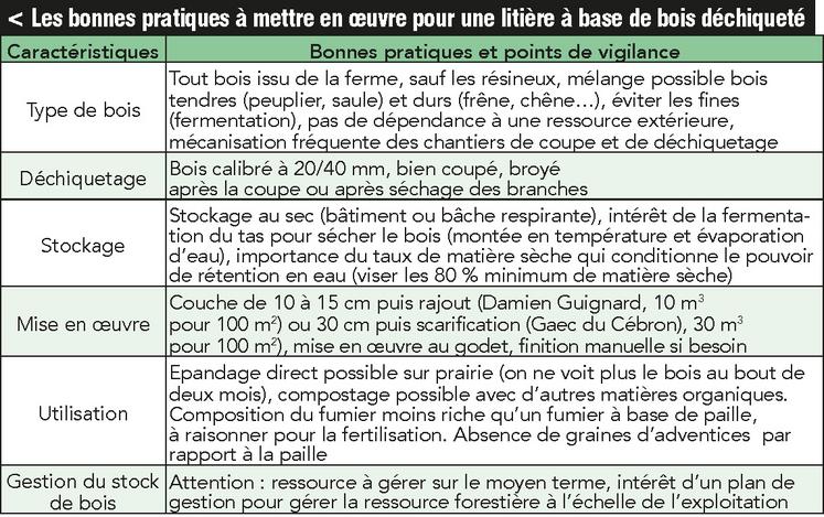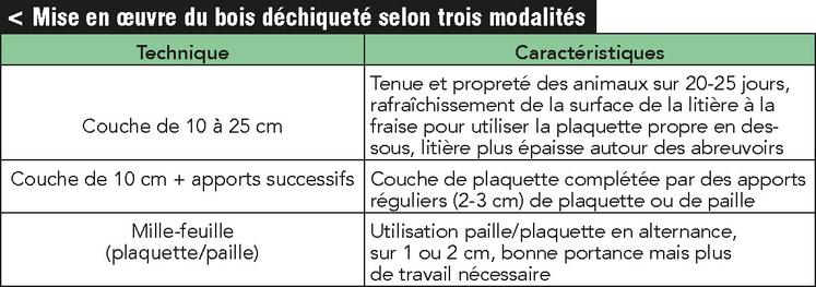 Le bois déchiqueté, issu de l'exploitation (entretien des haies, taillis, bosquets) ou issu de l'extérieur (connexes de scieries, de peuplier) peut représenter une alternative à la paille pour la litière, dans un contexte de moindre disponibilité.