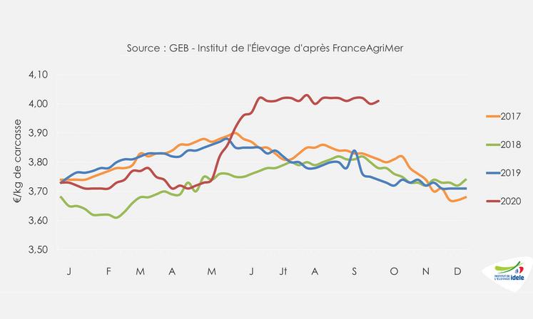 Le report de consommation de la restauration vers les repas pris à domicile bénéficie aux circuits de détail qui privilégient la viande française (tant en boucherie qu’en GMS). Le second confinement, en cours depuis le 5 novembre sur l’ensemble de la France, pourrait accentuer ce phénomène. Un bon point pour le prix des femelles. Depuis le printemps, la valeur de leur viande a progressé de 1 à 7 % selon les catégories (voir Graphe ci-contre)