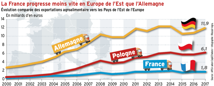 Dans un rapport sur la « compétitivité du secteur agricole et alimentaire français », diffusé le 26 janvier, les économistes de l'APCA (chambres d'agriculture) expliquent que la dégradation du solde agroalimentaire français vis-à-vis de l'Union européenne s'explique notamment par « la faiblesse des exportations sur les marchés des pays de l'Est européen, notamment ceux récemment intégrés à l'UE ».