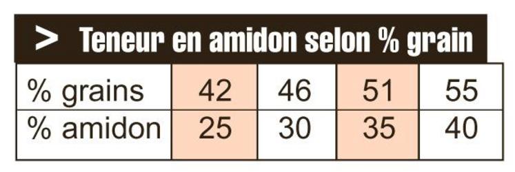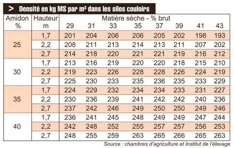On peut aussi cuber le silo après l'ensilage et faire une matière sèche lors de la récolte. C'est une méthode facile à mettre en oeuvre, notamment dans le cas de silos couloirs et dans la mesure où le maïs acheté n'est pas mélangé à celui produit. Cette méthode est cependant sensible au tassement. Dans les mesures réalisées, nous avons pu observer des écarts de 10 %. Pour les silos taupinières, moins bien tassés, il faut enlever 10 %. La teneur en amidon, c'est-à-dire la richesse en grain influence également la densité en kilogramme de matière sèche par m3.