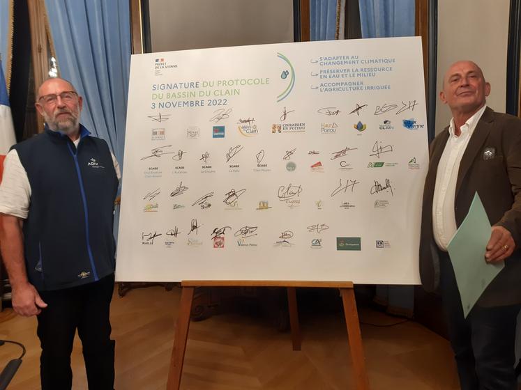Nous entrons dans une phase opérationnelle» lance Olivier Pin, avec le sourire. Le président de l’Adiv était présent jeudi 3 novembre en préfecture de la Vienne, pour la signature officielle du Protocole du Clain. À ses côtés, Bertrand Lamarche, le président de Rés’Eau Clain, et les 38 autres structures qui se sont prononcées pour cette deuxième version du texte. «Nous avons un consensus largement majoritaire» se félicite Jean-Marie Girier, le préfet de la Vienne. Sur les 54 acteurs du territoire qui ont été invités à se prononcer, 40 ont émis un avis favorable (soit près de 74%), 8 ont voté contre et 6 n’ont pas souhaité prendre position. Et même si le débat sur les réserves de substitution est plus que jamais tendu, notamment en lien avec la mobilisation à Saint-Soline, les 29 et 30 octobre, Bertrand Lamarche souligne un «exemple de démocratie participative. Le protocole a fait l’objet d’échanges, parfois tendus.
