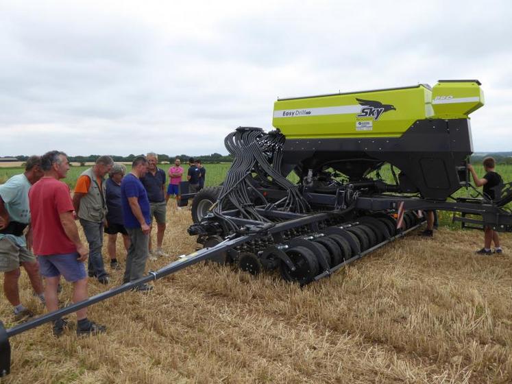 Après plusieurs mois de réflexions et d’attente, le semoir Sky Easydrill HD Pro de 6 m de largeur de la Cuma l’Epron vient de semer ses premiers hectares, le vendredi 12 juillet, au Gaec du Pis Aller à Les quatre noyers, à Saint-Gelais. Le principe de la mise en terre de ce semoir existe depuis longtemps mais quelques éléments viennent d’évoluer.