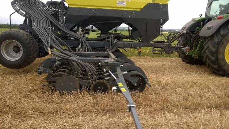 Un disque de plus grand diamètre (435 mm), incliné de 1,5° et formant une ouverture de 3,5° pour nettoyer le fond du sillon, réduisant la puissance consommée et minimisant le bouleversement entre les lignes de semis, muni d’une rasette monobloc moulée étroite pour passer dans les débris végétaux, a été installé. Une double descente de semis permettant un réglage de deux profondeurs de semis si besoin sur la même ligne (ex : féverole à 5 cm et colza à 1 cm) a aussi été ajoutée. Le tout est monté sur un balancier équipé à l’avant d’une roue à bandage caoutchouc de contrôle du terrage, supportant deux éléments de semis en se terminant par deux roues plombeuses en acier. La pression sur l’élément est ajustable jusqu’à 250 kg par disque et le transfert de charge hydraulique permet de déplacer la pression entre l’avant et l’arrière, selon les conditions climatiques.