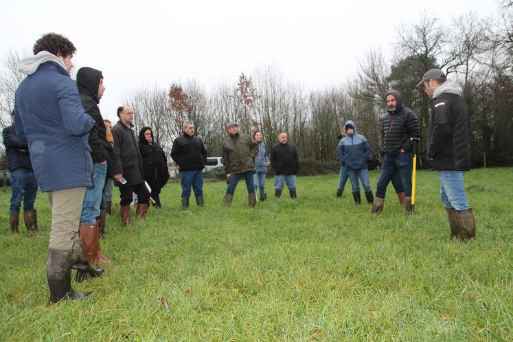 Échanges d’expériences à Genouillé, mardi dernier entre des éleveurs de vaches allaitantes de deux GIEE, et Michaël Brunet. Depuis une dizaine d’années, cet agriculteur pratique l’agriculture de conservation des sols.
