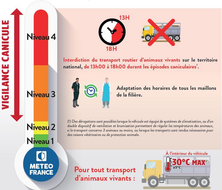 - Arrêté du 22 juillet 2019 : Interdiction du transport routier d’animaux vivants réalisé entièrement sur le territoire national, dans le cadre d’une activité économique, avec un point de départ et un point d’arrivée en France, de 13 h à 18 h durant les épisodes caniculaires publiés sur le site de Météo France.
