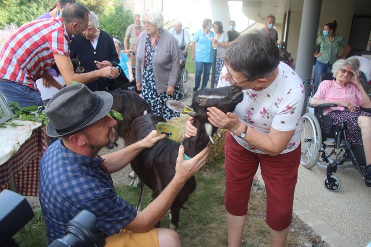 Des chèvres dans une maison de retraite, ça peut surprendre. Mais ça peut aussi être un formidable moyen de susciter des échanges. La semaine dernière, les résidents de l’Ehpad Marguerite Le Tillier, à Poitiers, ont ainsi accueilli avec un vrai enthousiaste trois chèvres poitevines, mais aussi leurs éleveurs, Philippe Massé et Christophe Boubon (Gaec du Mel'Elie à Messé, 79), ainsi que l’animateur de l’association de défense des chèvres poitevines, Léopold Denonfoux, et quelques fromages de chèvre à déguster. «C’est une animation proposée aux résidants et à leur famille. Et il ne faut pas seulement voir cela comme une distraction. C’est aussi un moment qui favorise les échanges, et qui permet d’éviter que les résidants soient trop enclavés dans la structure» lance Laurence Daury Reig, conseillère municipale de Poitiers, déléguée aux aînés.