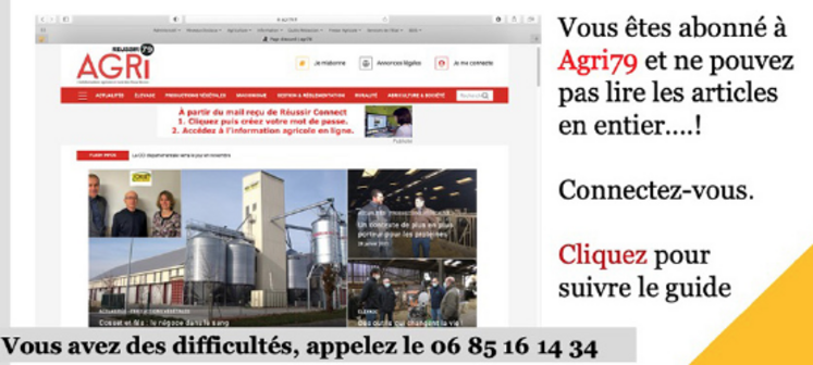 - Vous êtes abonné à Agri 79 + agri79.fr. Dans ce cas, votre compte n’est pas activé. Pour y remédier, rendez-vous sur agri79.fr pour suivre le tuto de connexion. Si au terme de la démarche, l’accès aux articles reste limité, peut-être n’avons-nous pas votre adresse mail dans notre fichier. Alors, n’hésitez pas, contactez-nous à abonnement@agri79.fr, ou appelez le 06 85 16 14 34.
