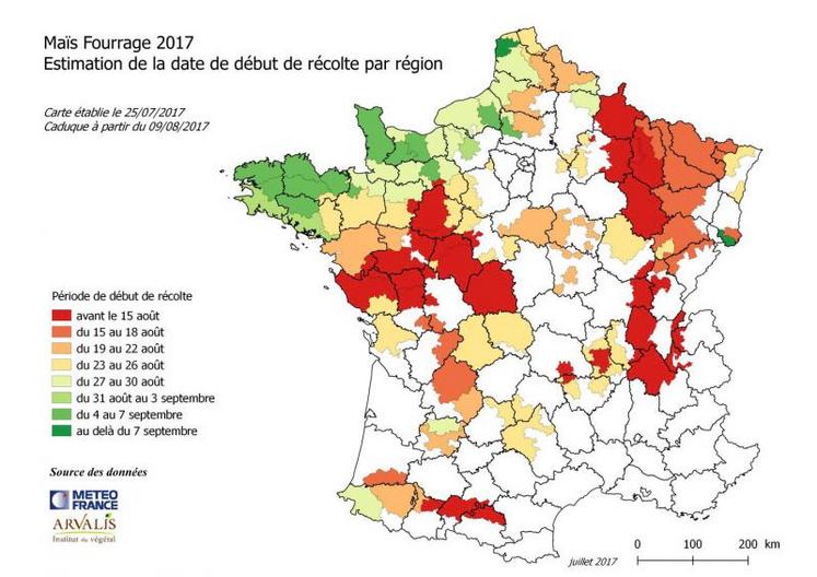 Arvalis Institut du végétal propose une carte des dates prévisionnelles de début des récoltes des maïs fourrage établie le 25 juillet. Elle ajuste, par région, la période possible de début des chantiers de récolte pour des scénarios climatiques à venir chauds et montre que la maturité s’est encore accélérée. L’objectif est de sensibiliser éleveurs, Cuma et entreprises de travaux agricoles de l’avancement de la maturité des maïs pour déclencher les chantiers de récolte à temps.