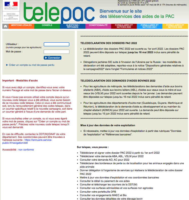 La télédéclaration des dossiers PAC 2022 ouvre ce 1er avril. Le dossier PAC concerne les aides découplées, les aides couplées végétales, l'indemnité compensatoire de handicaps naturels (ICHN), les aides en faveur de l'agriculture biologique (AB), les mesures agroenvironnementales et climatiques (MAEC) et l'aide à l'assurance récolte. Les demandes d'aides sont déposées exclusivement par Internet sur le site www.telepac.agriculture.gouv.fr avant la date limite du 16 mai 2022.