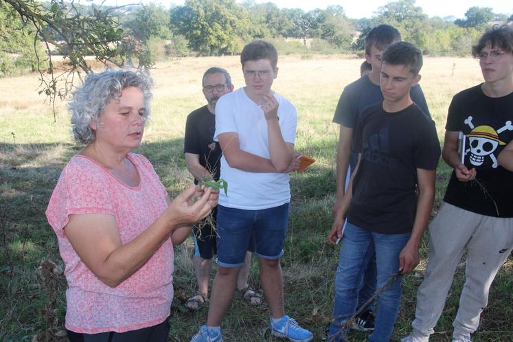 Blandine Grillon, botaniste indépendante, au milieu d'une prairie naturelle, analyse plusieurs espèces végétales qui ont été collectées sur place. Les participants à la porte ouverte, organisée par le Civam et la LPO chez Tony Massé, à Plaisance, lui ont coupé du plantain, "une plante résistante à la sécheresse et au piétinement", commente-t-elle, mais aussi du trèfle violet, de l'achillée millefeuille, du chardon, de la bardane, du jonc, carotte sauvage, agrostis… "Dans une prairie naturelle, on peut trouver jusqu'à une quinzaine de graminées et autant de légumineuses", précise la botaniste. Cette diversité floristique est vue comme un atout pour Tony Massé, éleveur ovin, avec un troupeau de 750 brebis. "Pour moi, il n'y a pas de mauvaises plantes. Quasiment toutes sont exploitées par les animaux", remarque l'éleveur qui a fait le choix de mener son troupeau en plein air intégral avec 160 ha de prairies naturelles.