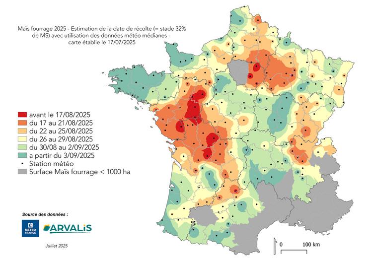 Dans le contexte d'une année à floraison précoce et avec un stress hydrique déjà présent sur plusieurs régions françaises, les données fournies par Arvalis permettent aux éleveurs, aux Cuma et aux entreprises de travaux agricoles d'anticiper au mieux les dates de récolte pour éviter des ensilages à des taux de matière sèche trop élevés. Une mise à jour de ces prévisions est prévue début août.