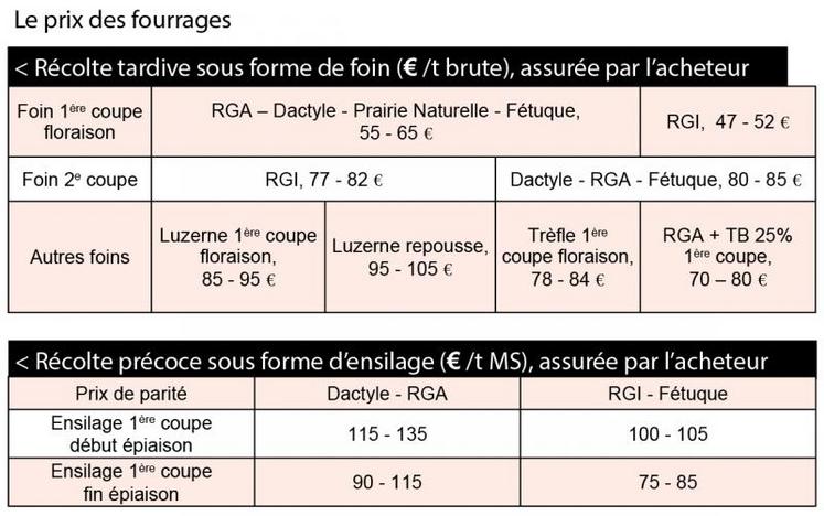 L'augmentation des prix du blé et de la paille, malgré une baisse du soja, entraîne l'augmentation des prix de parité pour les graminées. En effet, la méthode retenue pour calculer le prix de l'herbe récoltée plus ou moins précocement, ensilée ou fanée, s'appuie sur les prix de marché de ce mélange d'aliments. Ce calcul permet d'évaluer le prix de l'UF et des protéines du fourrage. Les autres caractéristiques (cellulose, teneur en amidon, minéraux, types de protéines ainsi que la facilité d'emploi) ne sont pas prises en compte. Bien que secondaires, elles peuvent toutefois influencer le prix lors de la décision d'achat.