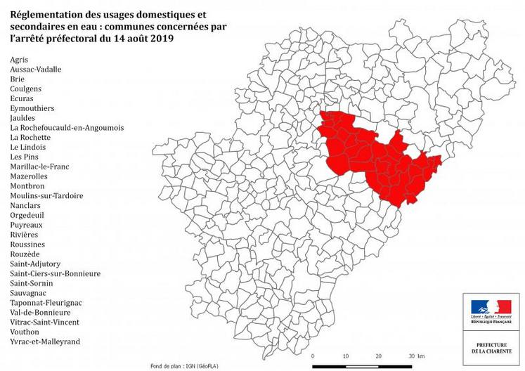 Si, jusqu’à présent, les restrictions des usages de l’eau concernaient l’irrigation, depuis la mi-août, un nouveau cap est franchi sur le bassin versant de la Tardoire. Dans les 30 communes situées dans ce bassin (voir carte), les prélèvements d’eau à usages « domestiques et secondaires » sont désormais interdits suite à un arrêté préfectoral, entré en vigueur le 14 août.