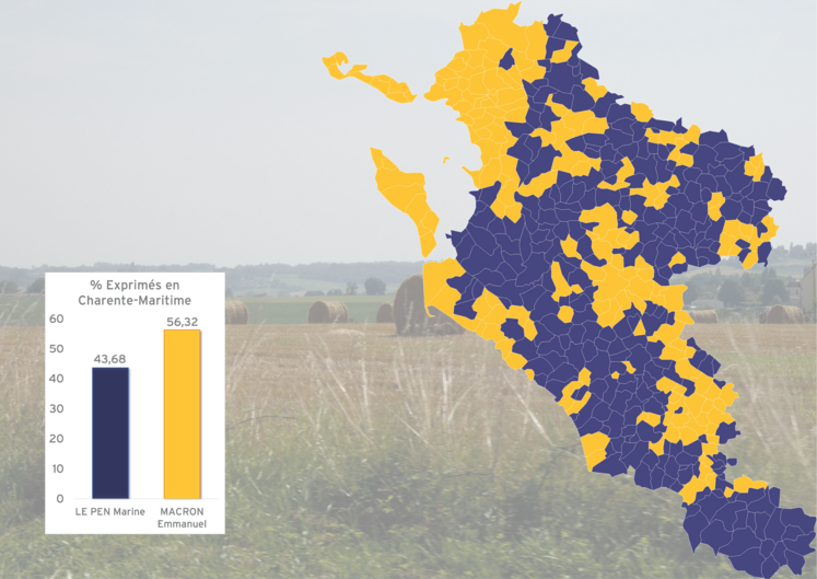 Dimanche 24 avril, les Charentais-Maritimes ont été 75,71 % à se déplacer dans les bureaux de vote (dont 5,02 % de votes blancs), un meilleur taux de participation qu’à l’échelle nationale (71,99 % - 4,57 % de votes blancs). Sur les 357 179 suffrages exprimés, 201 159 se sont portés sur Emmanuel Macron et 156 020 sur Marine Le Pen. Le président réélu recueille donc 56,32 % des voix (38,76 % des inscrits) et son adversaire 43,68 % (30,07 % des inscrits). C’est un pourcentage moins élevé pour Emmanuel Macron qu’au niveau national (58,54 %), et surtout un score en net recul par rapport au second tour de l’élection présidentielle de 2017, où il avait recueilli dans le département 64,84 % des suffrages exprimés. Il a obtenu moins de voix qu’en 2017 (215 465), alors même que le nombre d’électeurs était alors moins élevé (332 319).