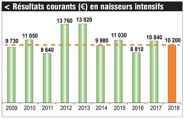 Le naisseur intensif réalise 70 vêlages sur 70 ha avec 1 UMO. La marge brute viande est en diminution de 12 euros/UGB, soit -3 %, malgré un produit viande stable. Les hausses du prix des broutards (+2 %) et broutardes (+3 %) ne comblent pas l’impact de la diminution des aides couplées allaitantes de 9 % et du prix des vaches de réformes qui baisse de 2 %. La hausse des charges de structure est de 1 %, très largement due à la hausse du pétrole. Le coût de production en 2018 est de 378 €/100 kg vif, en hausse de 1 % par rapport à 2017. Dans le même temps, le produit diminue, et permet une rémunération de seulement 0,62 Smic/UMO. Le résultat courant de 10 200 € reste très insuffisant.