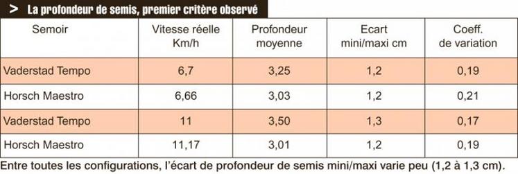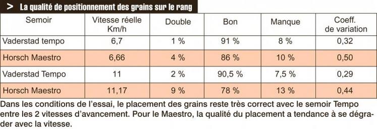 Entre toutes les configurations, l’écart de profondeur de semis mini/maxi varie peu (1,2 à 1,3 cm). Dans les conditions de l’essai, le placement des grains reste très correct avec le semoir Tempo entre les 2 vitesses d’avancement. Pour le Maestro, la qualité du placement a tendance à se dégrader avec la vitesse.