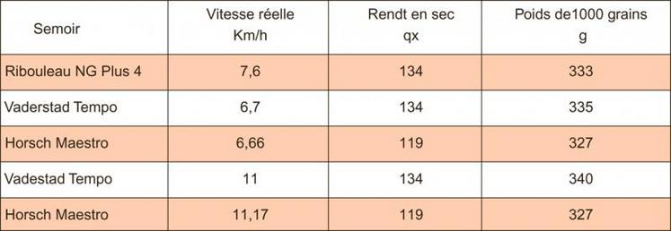Pour faire le point sur la capacité de ces semoirs, la chambre d’agriculture des Deux-Sèvres avec Arvalis et le journal Matériel Agricole ont mis en place un essai sur une parcelle du Gaec Le Petit Quéray à Saint- Gelais. Cet essai a été réalisé avec du maïs irrigué, semé le 18 avril 2013 et a comparé 3 semoirs monograine : 2 semoirs 8 rangs , un Vaderstad Tempo et un Horsch Maestro mis à disposition par les constructeurs. Et un semoir Ribouleau NG Plus 4, 6 rangs mis à disposition par la Cuma L’Epron de Niort. Ce dernier est à transmission mécanique, il n’est donc pas conçu pour semer à grande vitesse et est utilisé dans l’essai comme témoin pour le rendement. Les vitesses de travail retenues étaient de 7,11 et 15 km/heure. La vitesse la plus élevée n’a pas été possible avec le Tempo car le tracteur de 110 CV n’était pas assez puissant.