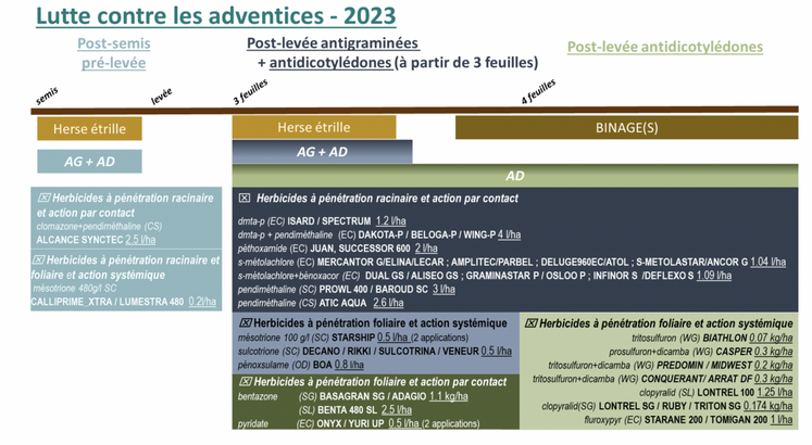 Ce positionnement vise prioritairement la lutte anti-graminées avec l’utilisation d’un chloroacétamide (par exemple Isard, Dual GS ou Juan). L’association d’un anti-dicotylédones permet d’élargir le spectre d’action. L’efficacité des anti-graminées racinaires est conditionnée par l’humidité du sol et le stade des adventices (en cours de levée ou n’ayant pas dépassé le stade 2-3 feuilles).