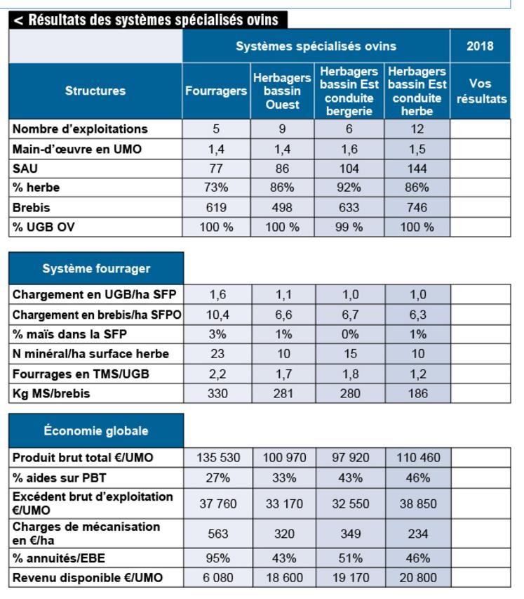 Les revenus disponibles moyens par UMO en 2018 en élevage ovins sont proches de 20 000 € pour les systèmes spécialisés, à l’exception du groupe fourragers qui dégage seulement 6 000 €/UMO. Ceux des systèmes mixtes ovins-cultures ou ovins-bovins sont de l’ordre de 20 000 à 25 000 €/UMO, à l’exception du groupe des ovins-bovins fourragers, à 35 000 €/UMO.