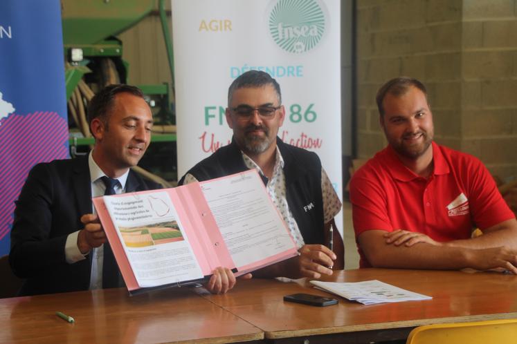 C’est le fruit d’un travail collectif entre OPA et représentants des élus de la Vienne qu’il convient de saluer. Pas moins de 11 organisations professionnelles agricoles, mais aussi les élus de la Vienne ont travaillé depuis le mois de mai à la rédaction de la charte d’engagement départemental des utilisateurs agricoles de produits phytosanitaires : JA 86, FNSEA 86, la Coopération Agricole, Les Melons du Haut Poitou, l’Association des Maires de la Vienne, la FDCuma, le Département, les vins du Haut Poitou, l’Association des maires ruraux de la Vienne, le Négoce Centre Atlantique et les EDT 86. Si les organismes sont partis de la charte nationale proposée par l’APCA, ils ont réalisé de nombreuses adaptations, et échangé régulièrement avec les services de l’État, pour s’assurer que le texte colle aux exigences réglementaires. Le 1er juillet, le texte avait été officiellement remis au préfet, qui l’a mis en consultation publique pendant 3 semaines. Deux observations ont été enregistrées, et le préfet a décidé de l’adopter tel quel. Il ne manquait donc plus que la signature des onze structures, et celle du préfet. Et c’est jeudi 1er septembre que cette étape a été officiellement faite, aboutissant à une entrée en vigueur de la charte dès le lendemain, le 2 septembre. À noter que les maires se sont engagés à diffuser le texte auprès de leurs administrés.