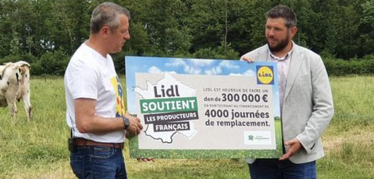 Multipliant les initiatives et les annonces à destination du monde agricole, Lidl a annoncé le 18 juin dans un communiqué de presse remettre un chèque de 300 000 euros au service de remplacement. Cela correspond à quelque 4000 journées de remplacement pour les agriculteurs. Cet argent provient d’une collecte réalisée dans les supermarchés de l’enseigne début mars. Cinq centimes d’euros étaient alors prélevés sur chaque produit vendu sous la marque «Saveurs de nos régions».