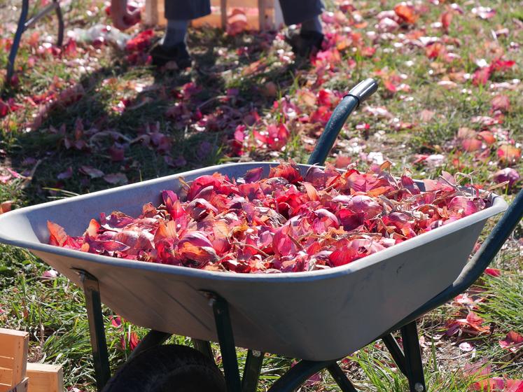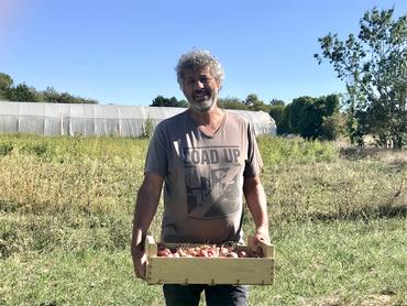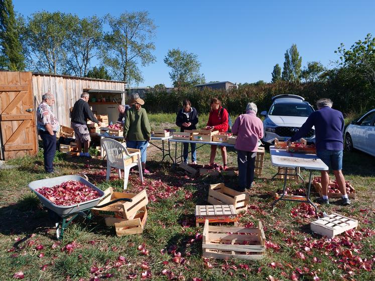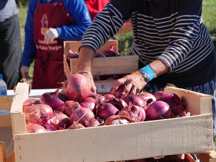 Sous un soleil matinal, les bénévoles s’activent pour trier les oignons. De nombreuses peaux jonchent le sol, reflets des couleurs automnales de cette journée de fin septembre. « La chaleur de cet été a fait des dégâts », constate Bernard Frelin, président de l’association de l’oignon de Saint Turjan. Les légumes «pourris» sont mis de côté, tandis que les pieds-mères sont soigneusement conservés pour être plantés à nouveau et monter en graine l’an prochain.