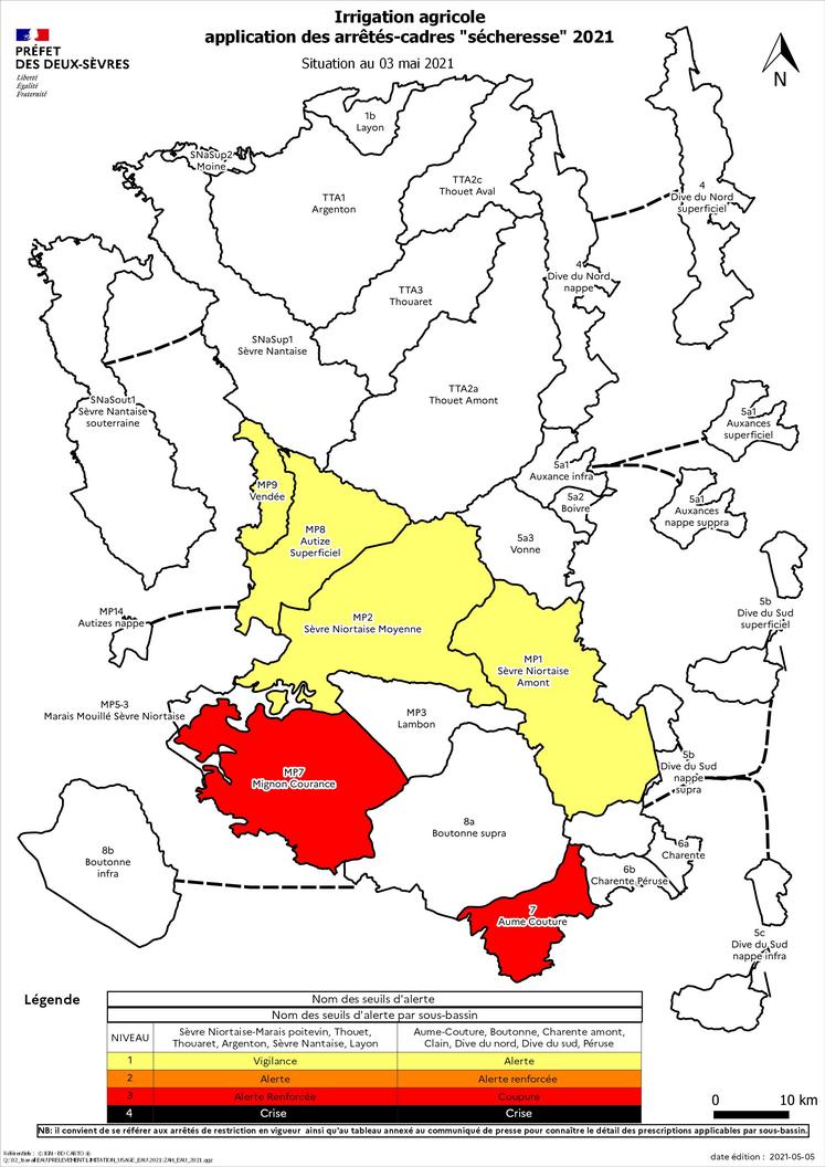 Les conditions météorologiques sèches se poursuivent et accentuent la tendance à la baisse du débit des cours d’eau et du niveau des nappes. Plus particulièrement, dans le sous-bassin de la Dive du Sud supra, le niveau de l'indicateur à la station de Bréjeuille supra à Couhé conduit à mettre en place une mesure réduction de 50 % des volumes hebdomadaires pour l'irrigation agricole, à compter du lundi 10 mai 2021 à 8 heures.