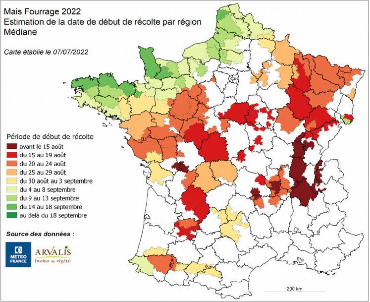 Arvalis – Institut du végétal propose la première carte des dates prévisionnelles de début des récoltes des maïs fourrage, établie le 7 juillet. Elle précise, par région, la période possible de début des chantiers de récolte, pour un scénario climatique à venir normal.