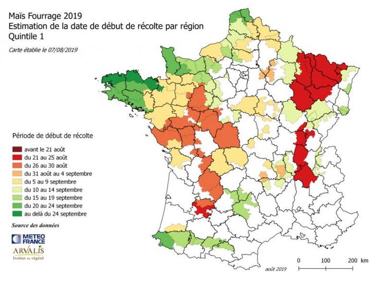 La carte ci-dessus, établie le 7 août par Arvalis, donne une estimation de la date des récoltes pour les secteurs de culture du maïs fourrage. Pour chaque « région », les experts d'Arvalis ont défini le groupe de précocité dominant et la date médiane des semis en 2019. Avec les données météo de l'année en cours et les données statistiques sur les semaines à venir, il est possible de prévoir une période à laquelle le stade optimal de récolte, 32-33 % de matière sèche plante entière, sera atteint. Cette prévision est régulièrement mise à jour pour prendre en compte le climat de l'année. Afin d'étaler la période de chantier, et pour éviter les récoltes tardives à taux de matière sèche trop élevé, la carte propose une période de début de récolte par région.