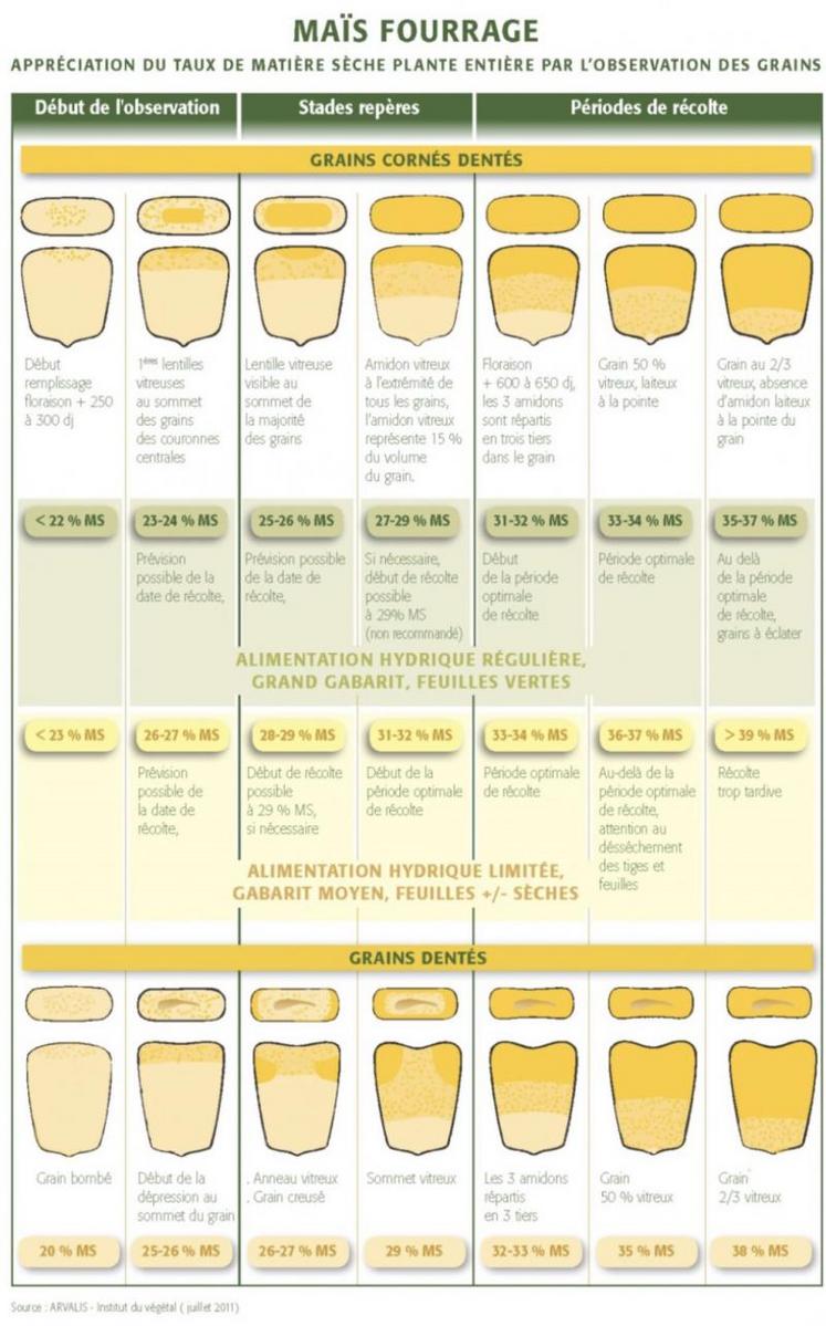 À partir de ce stade, il faut en moyenne 150 degrés-jours, base 6-30°C, pour atteindre le stade optimal pour la récolte fourrage, 32-33% MS plante entière. Cela correspond à une durée comprise entre 15 et 25 jours, selon la région et les conditions climatiques. Attention, en situation de fort stress hydrique l'évolution du taux de matière sèche du maïs peut être très rapide.