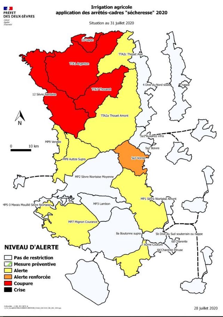 - Sèvre Niortaise moyenne (MP2) et le Marais Sèvre Niortaise (MP5.3), alerte à compter du 3 août - 8h : limitation des prélèvements d'eau à usage d'irrigation agricole prévue par le protocole de gestion collective de l'Etablissement Public du Marais Poitevin.