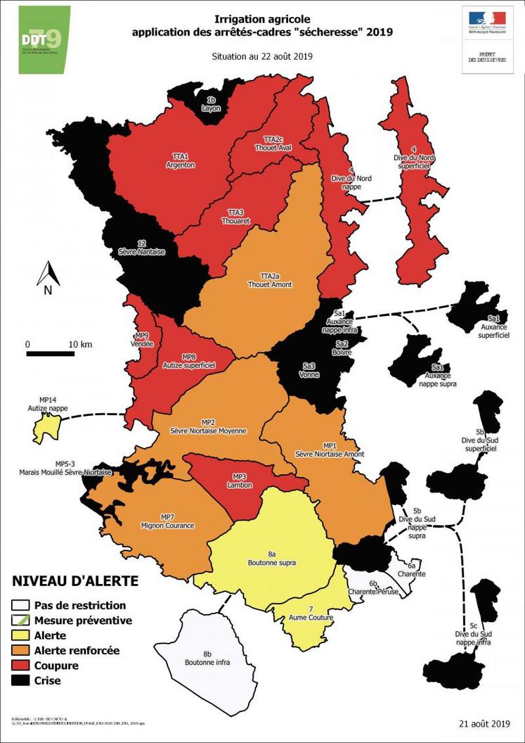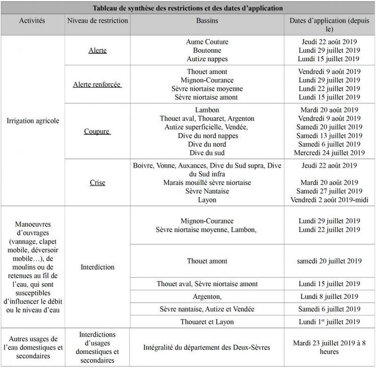 Le tableau ci-joint actualise l’ensemble des mesures en vigueur dans le département des Deux-Sèvres. Elles seront adaptées pour les bassins deux-sévriens, au vu de l’évolution de la situation. Les organismes uniques de gestion collective (OUGC) sont à la disposition des irrigants pour toute précision utile concernant ces mesures.
