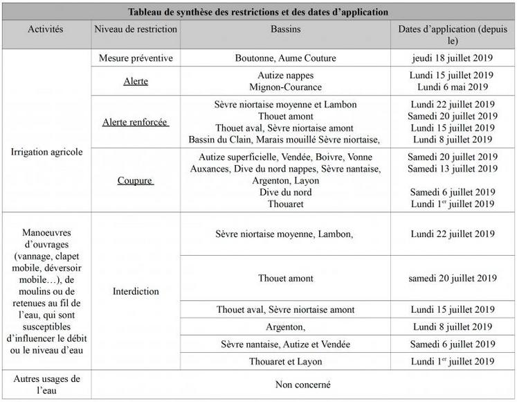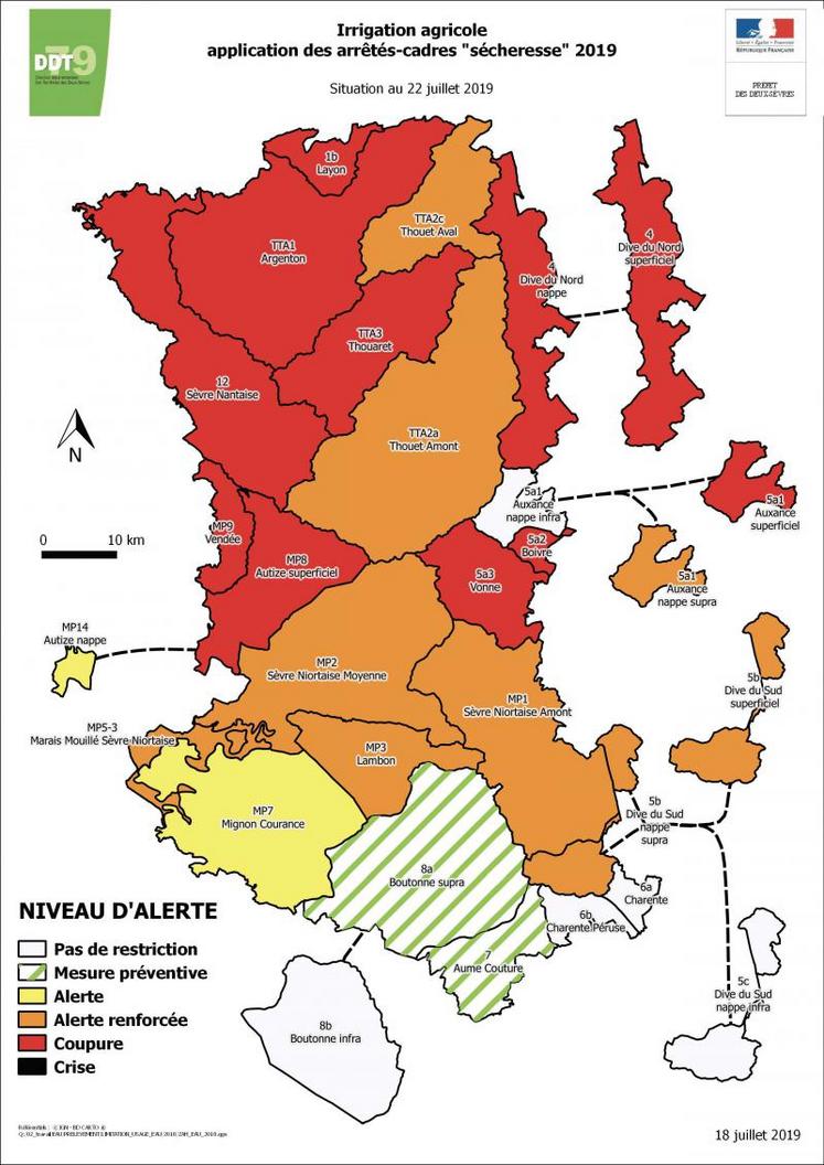 Le maintien des conditions météorologiques très chaudes depuis un mois, couplées à l'absence de précipitations significatives depuis plus d'un mois, nécessitent de prendre des mesures en l'application des arrêtés cadres sécheresse. Plusieurs seuils réglementaires spécifiques à l'irrigation agricole, définis par les arrêtés cadre inter-départementaux des bassins versants de la Sèvre Niortaise et du Marais poitevin et du Thouet ont en effet été franchis et nécessitent l'application de restrictions renforcées :